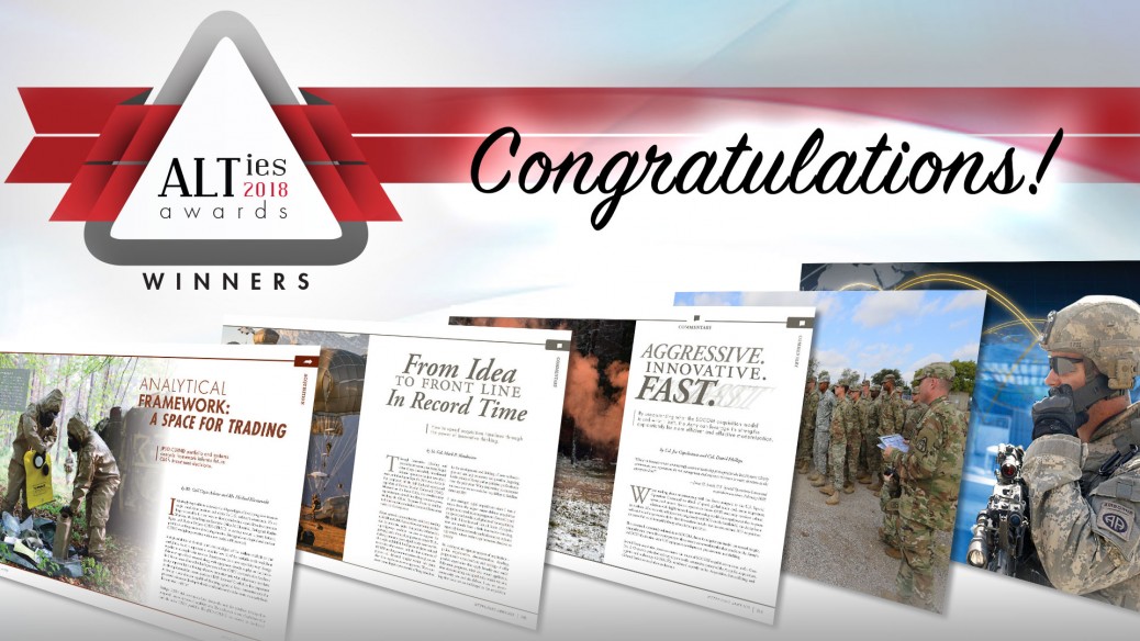 Want to see your name on next year’s ALTies list? Write an article or commentary, or design an ad for your organization, and send it to us at https://asc.army.mil/web/publications/army-alt-submissions/. Not only will you boost the profile of your organization, and share lessons with the community, but you could wind up with a new award to display.