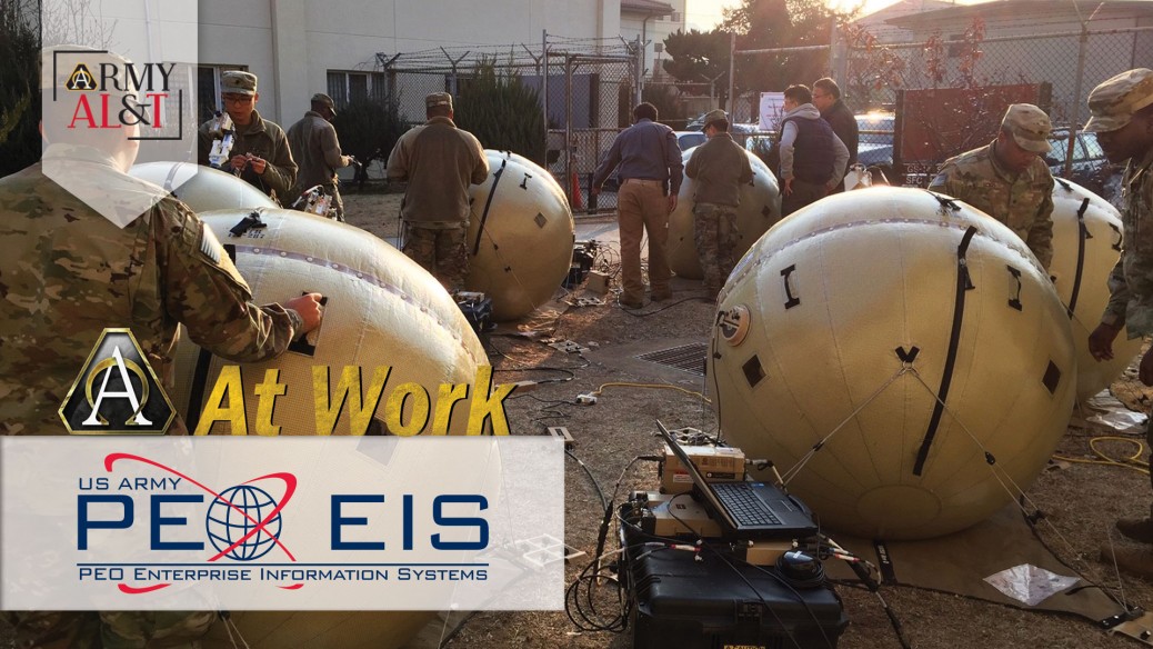 In conjunction with the U.S. Army Communications-Electronics Command, PEO EIS is fielding the Inflatable Satellite Antenna on the Korean peninsula. The antenna is a versatile, lightweight improvement to an existing mobile satellite dish (the Combat Service Support Very Small Aperture Terminal), and is easier to move, faster to set up and provides more flexibility to operators. (For more information, see the Faces of the Force profile of Capt. Zachary Schofield)